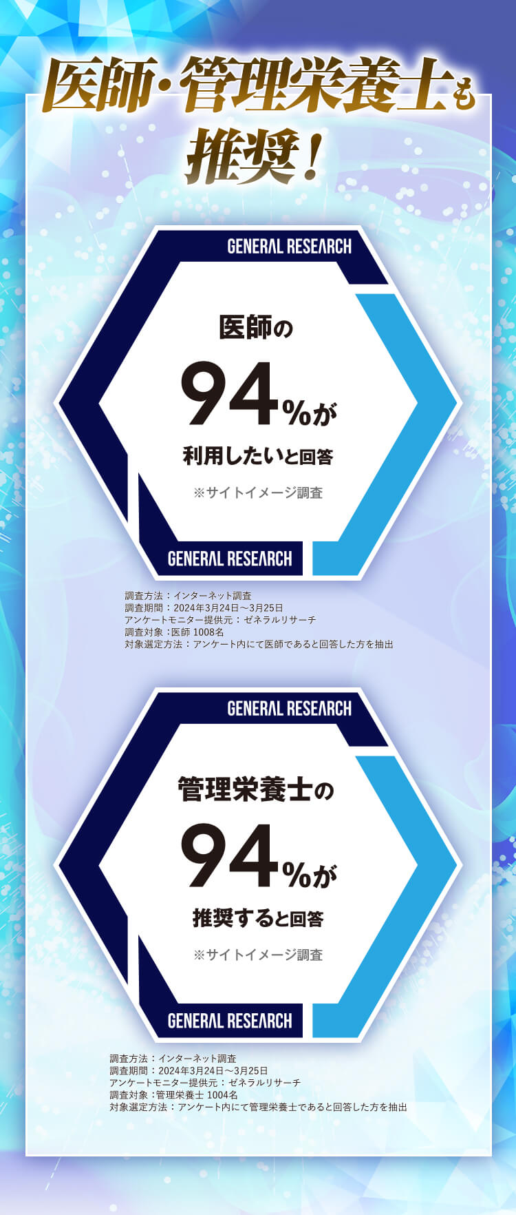 愛用者の声はもちろんのこと、医師と管理栄養士の94%が「利用したい」「推奨する」と回答してるそう!